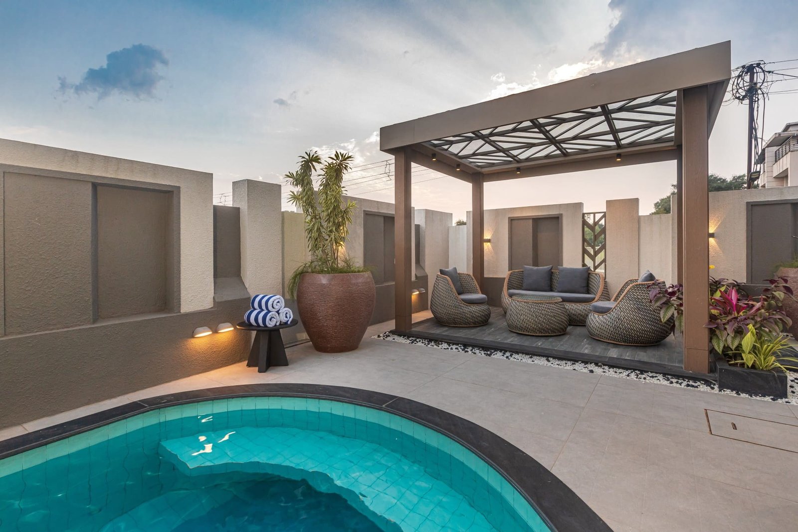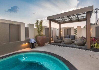 - The villa is designed with your relaxation in mind, including a luxe private pool with a projector screen, surrounded by a charming gazebo area—perfect for enjoying a coffee or unwinding with loved ones.
